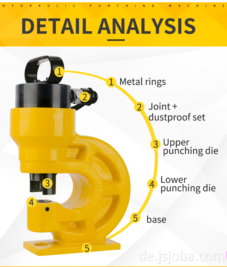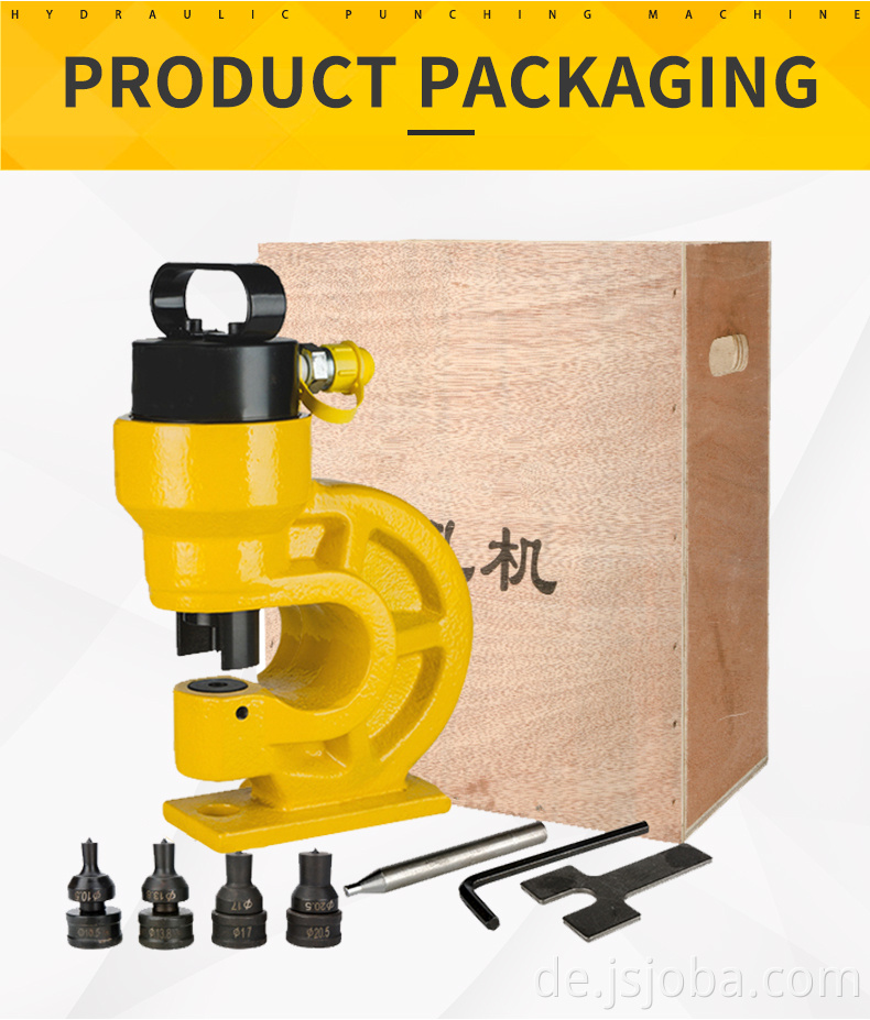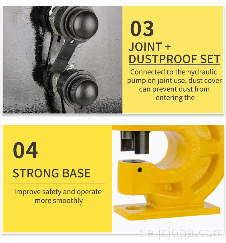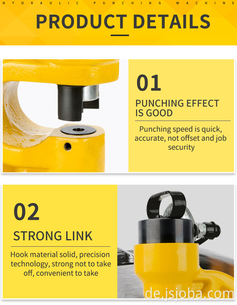 Die hydraulische Stanzmaschine vom geteilten Typ besteht aus einer manuellen Pumpe oder einer elektrischen Pumpe und einem hydraulischen Stanzkopf. Der Ölversorgungschlauch ist mit einem hydraulischen Schnellanschluss verbunden, der zuverlässig und schnell in der Versiegelung ist. Während des Betriebs gibt es keine Richtungsbeschränkung und es ist leicht zu montieren und zu zerlegen.