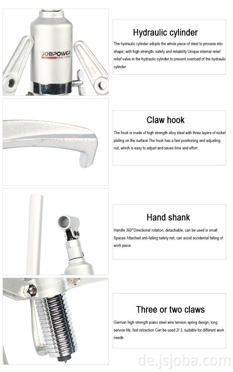 - Der hydraulische Puller wird direkt von der hydraulischen Startrute angetrieben, sodass sich die Antriebsstange selbst nicht dreht. Die Hakenklauenbasis kann den Abstand zwischen vorwärts und rückwärts mit dem Gewinde direkt einstellen. bewegt sich vorwärts und der Hakenklauen zieht sich entsprechend zurück.